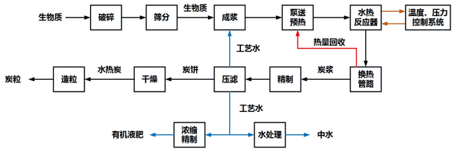 2. 生产过程中水不发生相变,且有完善高效的产物余热回收手段,工艺能耗低,生产每吨生物质水热炭仅消耗热量3GJ、电能50 kWh;