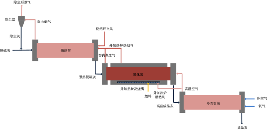 上图:三段式回转富氧外加热脱硫灰氧化技术工艺流程图