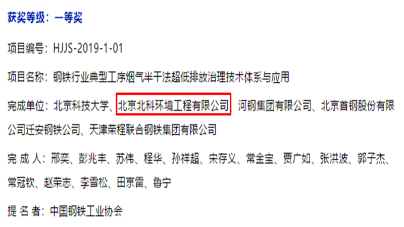 为充分发挥科技奖励对环保产业技术进步的促进作用,建立以企业为主体、市场为导向、产学研用相结合的环保产业技术创新体系,鼓励我国环境技术原始创新、集成创新,促进环保产业高质量发展,支撑生态环境治理,加快改善环境质量,2019年12月20日,中国环境保护产业协会根据《环境技术进步奖奖励办法(试行)》的规定,经过专家辅导、单位提名,评审委员会评审、现场答辩、奖励委员会审定和公示,由北京凯时凯时首页环境工程有限公司、北京科技大学、河钢集团、北京首钢股份有限公司、北京首钢国际工程技术有限公司、天津荣程联合钢铁集团有限公司联合完成的科技成果“半干法烟气超低排放与多功能耦合关键技术及其在钢铁行业的应用”项目,荣获 “钢铁行业典型工序烟气半干法超低排放治理技术体系与应用” 2019年度环境技术进步奖一等奖。